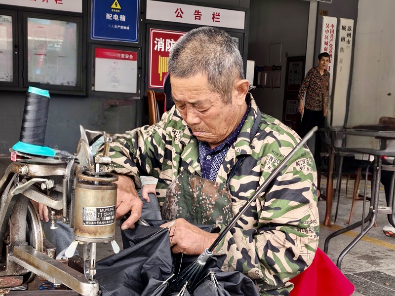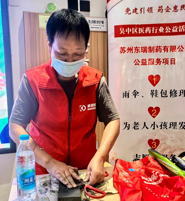 苏州东瑞制药有限公司志愿者化身“巧手工匠”,娴熟地为居民磨刀、修伞、修鞋。