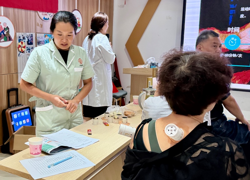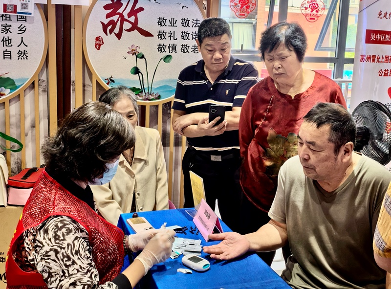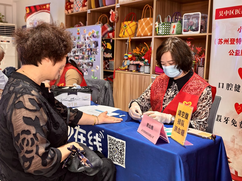 苏州登特商贸有限公司总经理朱黎细心为居民测血糖,苏州市号外大药房有限公司陆药师耐心记录血压数据并讲解健康注意事项。