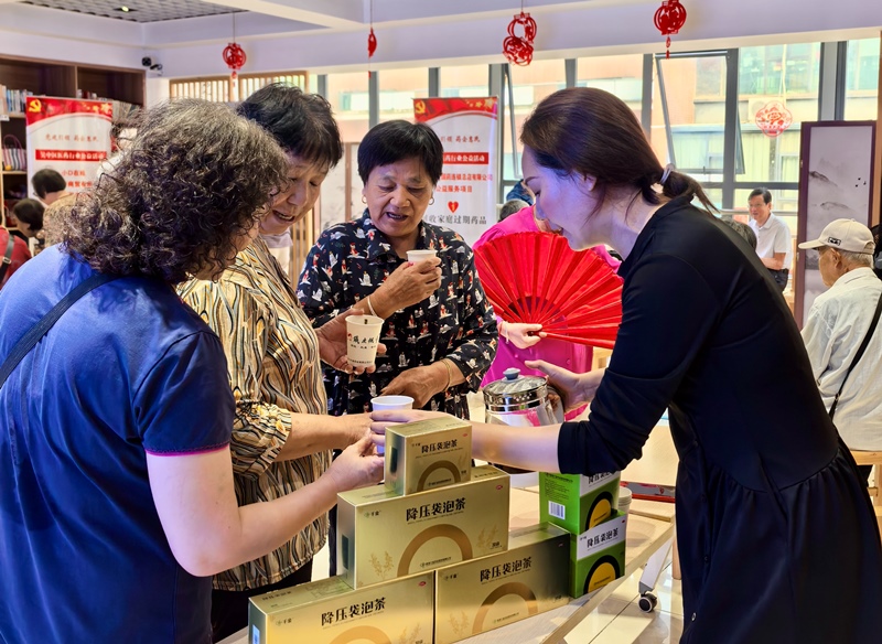 天皇药业的石斛花茶、千金药业的降压袋泡茶都很受居民欢迎,大家一边品尝,一边听工作人员讲解养生茶的功效。