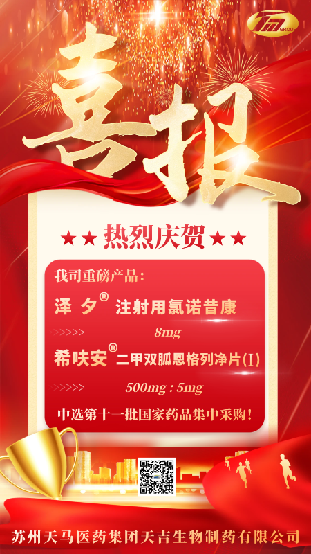 苏州天马医药集团天吉生物制药有限公司的两个重磅产品——“泽夕®注射用氯诺昔康”、“希呋安®二甲双胍恩格列净片(Ⅰ)”成功中选第十一批国家药品集中采购!