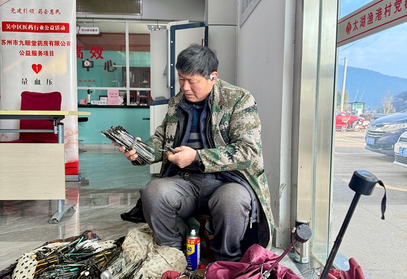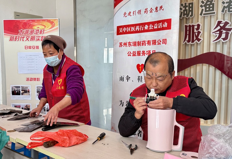 苏州东瑞制药有限公司志愿者免费为村民修理小家电、雨伞,提供磨刀服务。