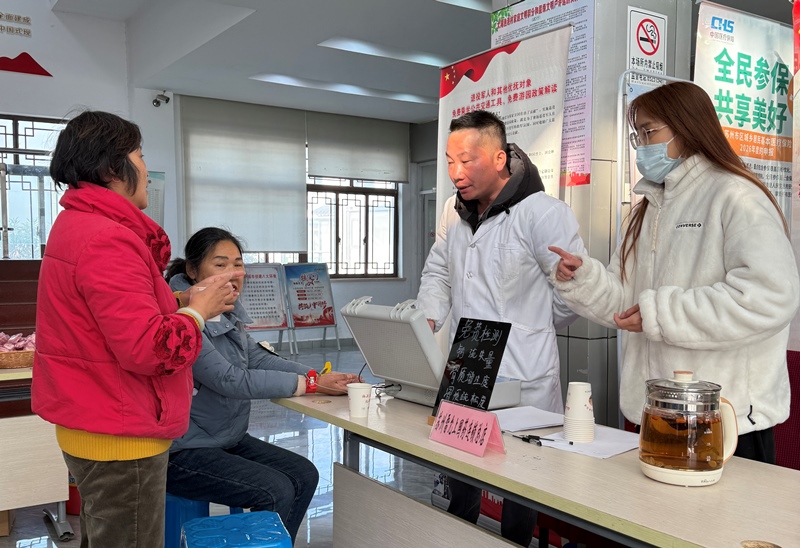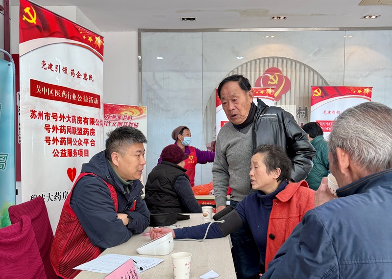 吴中区医药行业商会党支部书记、苏州市号外大药房有限公司总经理颜炳忠为村民量血压,耐心讲解实用的保健知识。