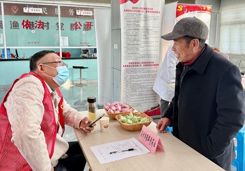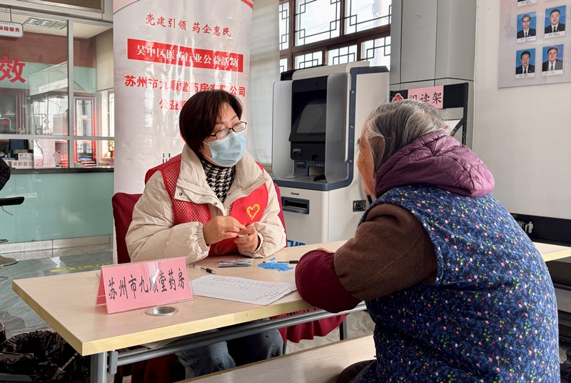 苏州市九顺堂药房王爱萍经理为村民提供空腹血糖检测服务,为健康添力。