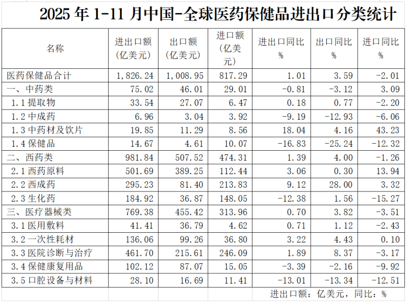 2025年1-11月中国医药保健品进出口统计分析