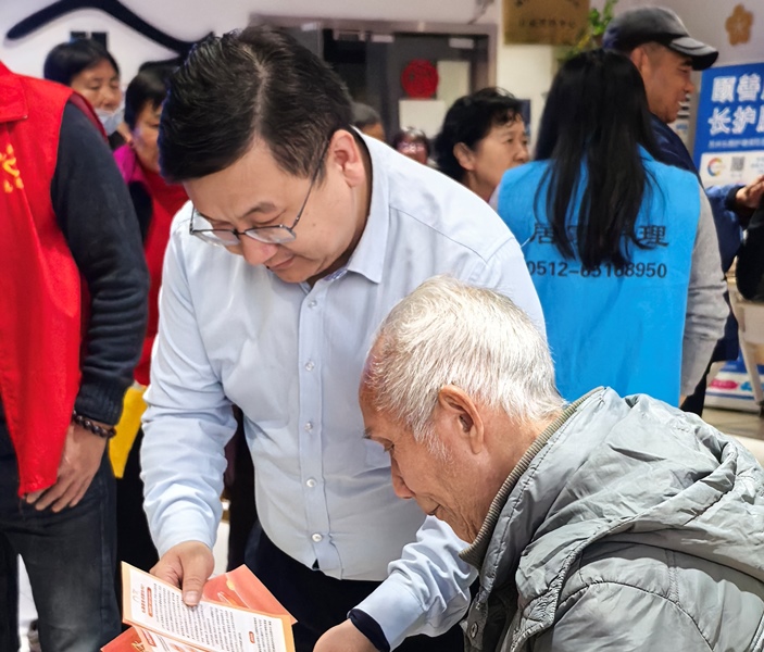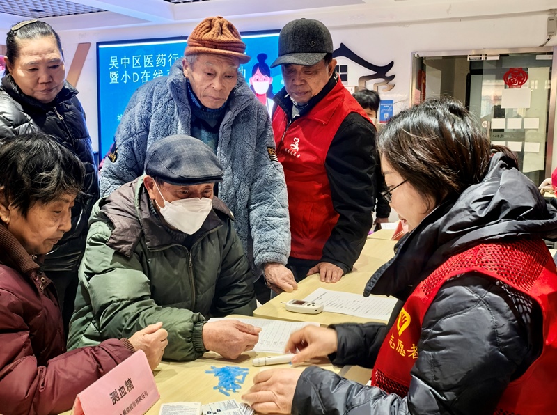 苏州市号外大药房的服务台前,志愿者耐心细致地为老人们测量血压,轻声叮嘱着饮食和用药的注意事项。