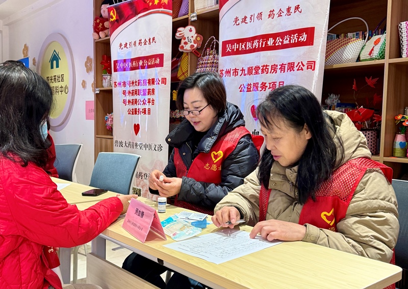 苏州市九顺堂药房王爱萍经理一丝不苟地为居民检测空腹血糖,认真记录数据,为大家建立健康台账。
