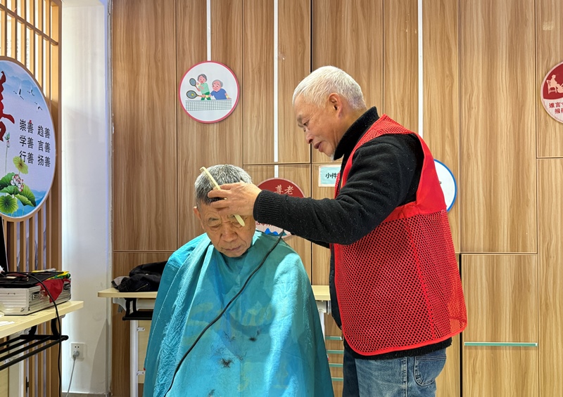 阳光苑社区日间照料中心的理发师手法娴熟,剪刀上下翻飞间,老人们焕然一新,一派过年景象。