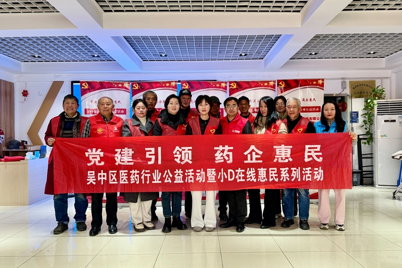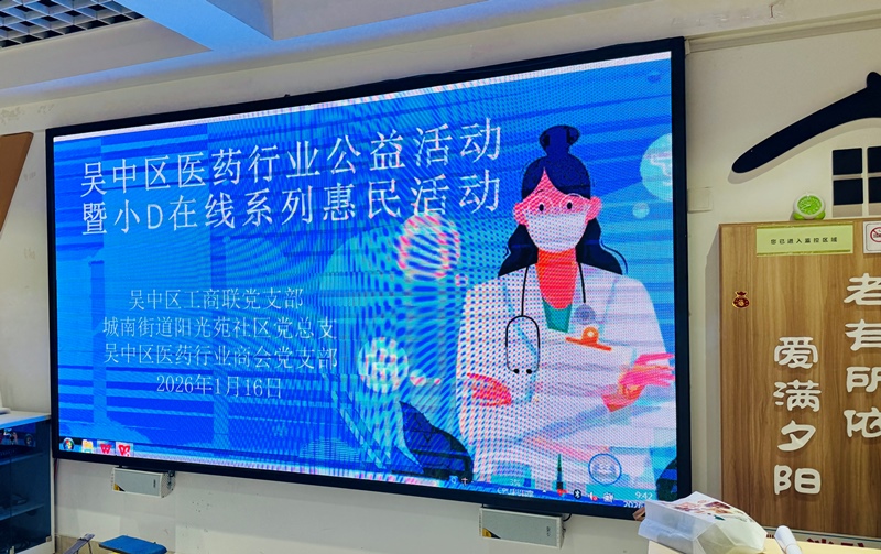 2026年1月16日上午,由吴中区工商联党支部、吴中区医药行业商会党支部联合主办,苏州登特商贸有限公司承办,吴中区城南街道阳光苑社区党总支、苏州东瑞制药有限公司等多家单位协办的吴中区医药行业公益活动暨小D在线系列惠民活动,在阳光苑社区二楼日间照料中心温情开启。