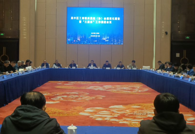 2026年4月13日,吴中区工商联召开所属商(协)会规范化建设暨 “三服务” 工作推进会议。区工商联主席杜荣尚,副主席吴逸凯、朱亮,各商(协)会秘书长及区工商联机关全体工作人员参加会议。本会副会长兼秘书长沈建伟出席会议。