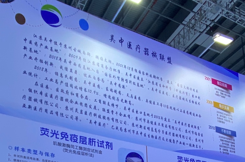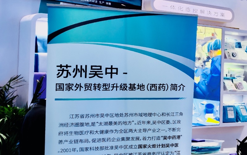 “吴中医疗”展位面积为144平方米。展台上都有醒目的“吴中出口基地”“吴中医疗”标识与《苏州吴中-国家外贸转型升级基地(西药)简介》版面,展现了苏州吴中-国家外贸转型升级基地(西药)概况及基地内医疗器械产业的整体形象。