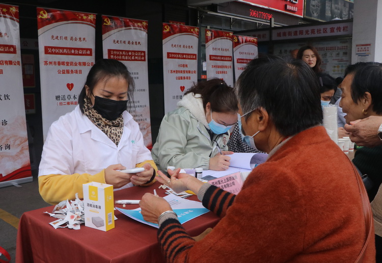 苏州市雷允上国药连锁总店有限公司吴中店陈倩店长带来了居民最期待的服务项目——测血糖、量血压。好多居民都是空腹来到现场,有序排起长队,保持防疫安全距离。