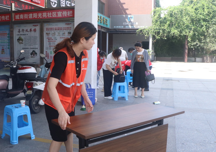 城南街道阳光苑社区党总支派两位副主任到场协助工作。活动开始前,配合承办单位摆放桌椅,布置现场;活动中,与吴中区医药行业商党支部书记颜炳忠进行交流,一起征求志愿者、居民的建议,提升共建质量;活动结束,又亲自动手,把活动所用的桌椅、用品搬进储物间。