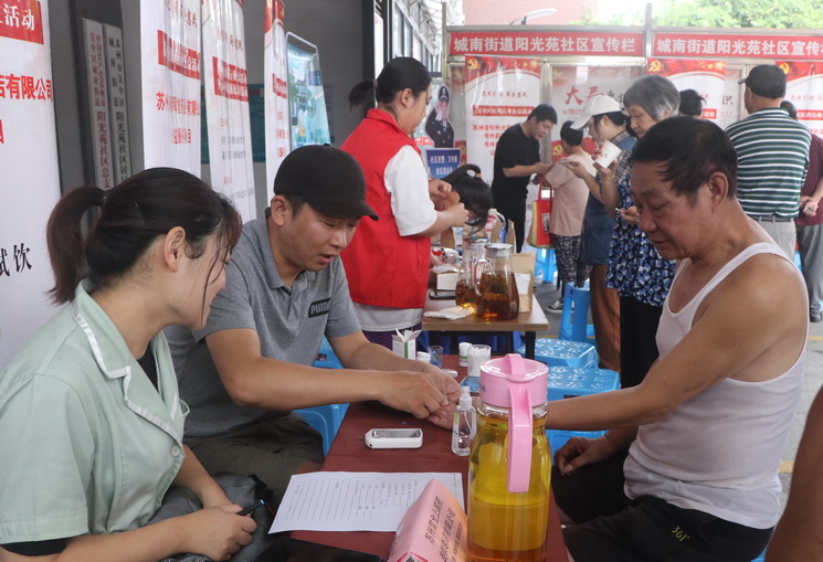 理事单位苏州雷允上国药连锁总店有限公司除了血压检测、尿酸检测之外,还带来雷允上招待贵宾的降脂茶,给居民试饮。