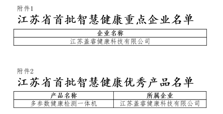 除此之外,2019年6月,盖睿科技还入选江苏省工业和信息化厅、江苏省民政厅、江苏省卫健委联合发布的“江苏省首批智慧健康重点企业名单”、“江苏省首批智慧健康优秀产品名单”。