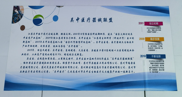 吴中出口基地展位上《吴中医疗器械联盟》的版面,介绍了吴中出口基地的发展历程和吴中医疗器械产业的概况。吴中区医药行业商会、吴中区生物医药及大健康产业联盟协会负责人亲临展位,接待参观者,让国内外客商不仅看到了吴中医疗器械企业的创新成果,还加深了对“吴中药港”的进一步了解。